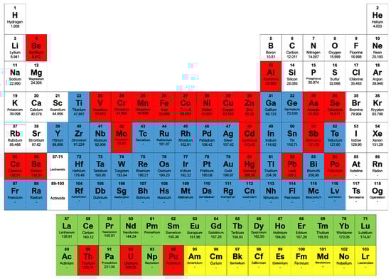 Periodic table of elements. Metals/metalloids are highlighted on the basis of the main characteristic that define them as “heavy”: density > 5 g/cm3 (blue); toxic (red); rare (green); synthetic (yellow).