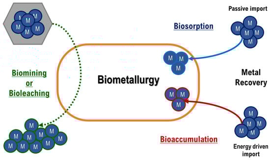 Schematic representation of metal bioprocesses in biometallurgy. Metals (blue circles) can be extracted from ores through biomining/bioleaching (green arrow) and they can be recovered into the cell by passive import (biosorption—blue arrow) or energy driven transport (bioaccumulation—red arrow).