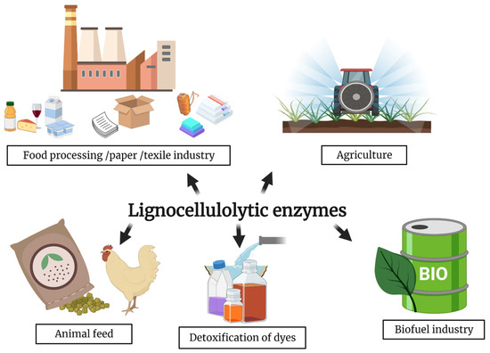 Industrial applications of lignocellulolytic enzymes. In food processes cellulases and xylanases are employed to improve the shelf life of dairy products and to hydrolyze monosaccharides in milk processing; they are also used in winery industries and to decrease viscosity of fruit juice. Also, laccases are used to increase quality of beverages and food, for example eliminating toxic substances. In pulp/paper industry laccases and xylanases enhance pulp bleaching for paper manufacturing, and cellulases improve flexibility and softness of fibers. Lignocellulolytic enzymes can be employed for improving nutrient digestibility of animal feeds, for enhancing color and surface brightness of fabric in textile industry, for textile dye bleaching, for synthesis of complex polymers. In agriculture, they are involved in fruit ripening and defense mechanisms against insects. Laccases are employed in wastewater treatment of colored waters. Lignocellulolytic enzymes are used in biorefinery systems to produce biofuels [103,127,128] (Created with BioRender.com (accessed on 20 January 2021)).