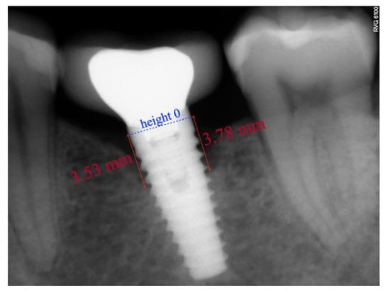 - Nandal, S.; Ghalaut, P.; Shekhawat, H. A radiological evaluation of marginal bone around dental implants: An in-vivo study. Natl. J. Maxillofac. Surg. 2014, 5, 126–137. [Google Scholar] [CrossRef] [PubMed]