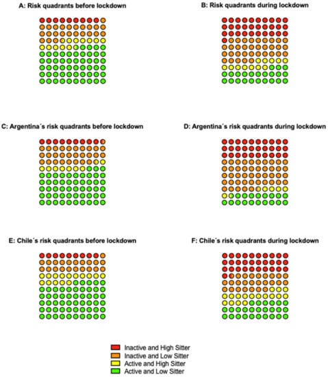 Figure 1 represents risk-quadrants according to PA recommendations and ST cut-point. 9.1% of the total sample was classified in the higher-risk quadrant and 54.3% in the lower-risk quadrant previous to COVID-19 pandemic. However, during lockdown, the number of cases tripled in the higher risk quadrant and halved in the lower risk quadrant. Regarding country-specific quadrants, Chile’s higher-risk and Argentina’s lower-risk scenario worsened from 8.9% to 31.5% and from 53.0% to 18.6%, respectively.