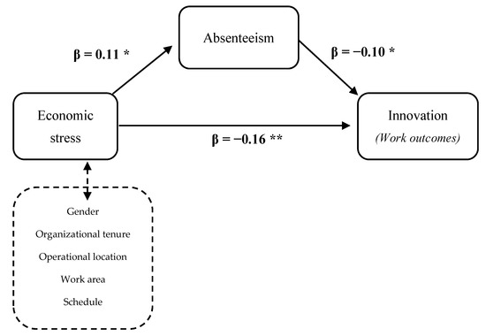 A mediation analysis was performed to define the role of absenteeism. The standardized fit indices of the model showed a desirable fit (RMSEA = 0.045; GFI = 0.951; CFI = 0.90). Confidence intervals (CIs) were established using a multiple mediator model. Regarding the indirect effect, economic stress has a significant effect on absenteeism (β = 0.11; p < 0.02; 95% CI = 0.01, 0.11), which, in turn, shows a significant effect on innovation (β = −0.10; p ≤ 0.02; 95% CI = −1.85, −0.16). As can be seen in Figure 2, there is a significant direct effect of economic stress on innovative behavior (β = −0.16; p < 0.01: 95% CI = −0.14, −0.04). In conclusion, after controlling the effects of different socioeconomic variables, absenteeism partially mediated the relationship between economic stress and innovative behavior. The absenteeism variable can explain a 3% of the variance in innovative work behavior (R2 adj = 0.03; p < 0.01).