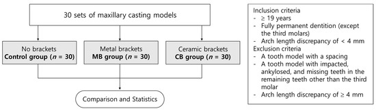 The study protocol is outlined in the flow chart shown in Figure 1. The sample comprised 30 sets of maxillary models obtained from 30 different patients, which were duplicated three times and used for each group. The sample size was determined by adding values from a previous study using G*Power (version 3.1, Universität Kiel, Kiel, Germany) [30,31]. The inclusion criteria were as follows: (1) a minimum age of 19 years; (2) fully permanent dentition (except the third molars); and (3) a tooth model with an arch length discrepancy of <4 mm. The exclusion criteria were as follows: (1) a tooth model with a spacing; (2) a tooth model with impacted, ankylosed, and missing teeth in the remaining teeth other than the third molar; and (3) a tooth model with an arch length discrepancy of ≥4 mm.