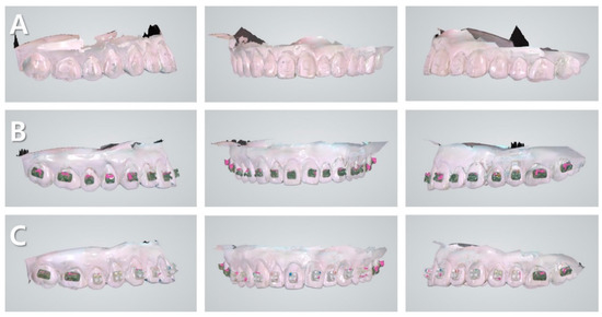 Scan image of the experimental on Trios Pod 2®. (A) Control group (the model without a bracket), (B) MB group (the model with a metal bracket), and (C) CB group (the model with a monocrystalline bracket).