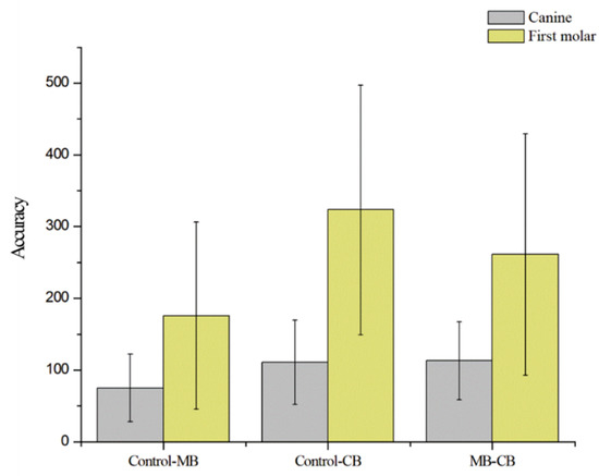 The STL files of three groups of models were overlapped to determine the deviation between the presence and type of orthodontic bracket, which was measured in micrometer. The digital models were overlapped and the mean values of deviation at the cusp tips of the right and left canines, and at between the mesiobuccal cusp tips of the right and left first molars were compared (Figure 4 and Table 3); no significant differences were observed among the right and left canines and the right first molar. The first molar on the left showed a significant difference of 176.34 μm in deviation between the control and MB groups, 385.99 μm between the control and CB groups, and 305.48 μm between the MB and CB groups (p < 0.05).