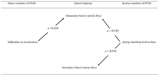 Correlational analysis revealed that the mothers’ ratings of their elementary school sons’ difficulties with socialisation were significantly directly correlated with their CASI-4R PTSD score (ρ = 0.424, p = 0.006), and the boys’ coping strategy of Saying something back to bullies was significantly inversely correlated with their CASI-4R PTSD score (ρ = −0.319, p = 0.042). However, only the secondary boys’ coping strategy of saying something back to them was significantly inversely correlated with their CASI-4R PTSD scores (ρ = −0.542, p = 0.025). Mothers’ ratings of their sons’ difficulties in socialisation were not significantly correlated with the boys’ PTSD score (ρ = 0.228, p = 0.379). None of the other ASD-related variables or the boys’ coping strategies were significantly correlated with the boys’ CASI-4R PTSD scores within either of these two school-defined subgroups. Figure 1 presents these results in graphic format.