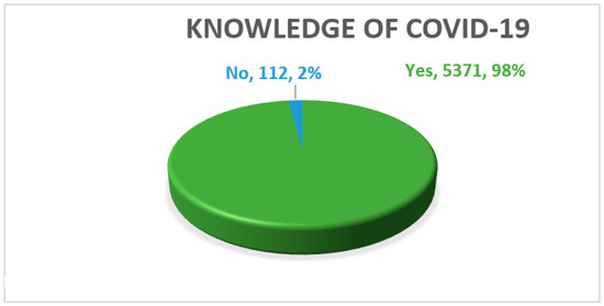 Figure 1 illustrates the study findings in terms of level of knowledge. The results show that most of the respondents, 5371 (98%), knew about COVID-19 as an infectious disease. However, 112 (2%) of the respondents stated that they were not aware of that.