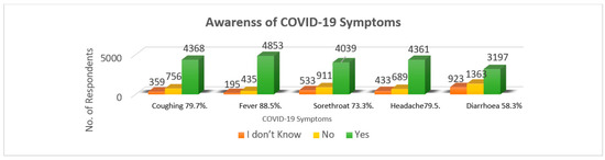 Figure 2 summarizes the awareness of COVID-19 symptoms. Most respondents identified coughing, fever, sore throat, headache, diarrhea at 4368 (79.7%), 4853 (88.5%), 4039 (73.3%), 4361 (79.5%), and 3197 (58.3%), respectively, as the COVID-19 symptoms.