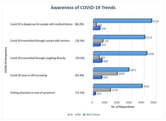 Figure 3 summarizes the awareness of COVID-19 trends. Most respondents stated that they were aware of the need to visit the physician in case of exposure, COVID-19 cases are still rising, the disease can be transmitted through coughing directly, and individuals with underlying medical conditions were at the highest risk at 3952 (72.1%), 2875 (52.4%), 4338 (79.1%), and 4734 (86.3%). Additionally, 4173 (76.1%) agreed that contact with infected surfaces increased the chance of contracting the disease.