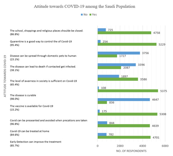 The attitude towards COVID-19, how the Saudi population perceived the COVID-19 pandemic was investigated based on the causes, prevention measures, and available treatment options. For instance, the respondents rejected the assumption that domestic pets could spread the virus to humans, and that the disease always ended in death. This attitude coincides with study findings that the condition does not spread from domestic animals to humans. However, the results show that many respondents stated that there were no vaccines for COVID-19 [23]. The results for this point could be attributed to a vaccine having not been approved at the time of the study. Knowledge of the misconceptions about COVID-19 is essential in strengthening adherence to the containment measures.
