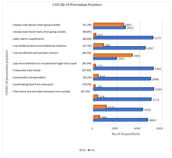The study also aimed to identify the ways the Saudi population has adopted COVID-19 management. Figure 5 below illustrates the results. Most respondents agreed that they stay at home and only take necessary trips outside 4803 (87.6%), avoiding taking food from the restaurants 4359 (79.5%), and avoiding public transportation 5112 (93.2%). In addition, most stated that they frequently wash hands 5344 (97.5%), pay more attention to personal hygiene than usual 5068 (92.4%), use disinfectant and sanitizer solution 5305 (96.2%), take vitamin supplements 4597 (83.8%), and always wear a facial mask when going outside 5275 (96.8%. About 2815 (51.3%) stated that they always wear gloves when going outside. However, more than third of participants undertaken practices were using herbal products and traditional medicine, 2041 (37.2%).