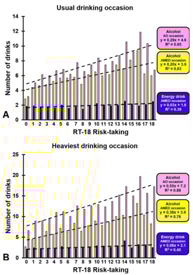 The relationship between risk-taking and alcohol and energy drink consumption. Shown are the mean number of drinks consumed for each RT-18 risk-taking score for usual drinking occasions (A) and past month heaviest drinking occasion (B). Abbreviations: AO = alcohol only; AMED = alcohol mixed with energy drink; RT-18 = risk-taking questionnaire, 18 items.