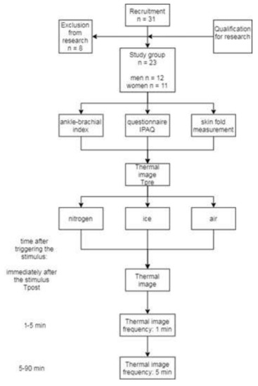 The scope of duties during the study was divided between 2 appropriately trained researchers: one person was responsible for pre-treatment procedures and the performance of the procedure, while the other was responsible for taking thermographic images and their subsequent processing. The tests were carried out in the morning (8:00–11:00 a.m.) and in accordance with the standard laboratory protocol of the measuring and testing equipment used.