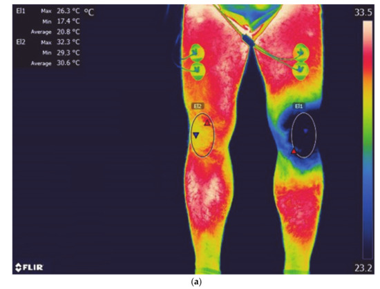 Skin temperature is a very important physical attribute used as a diagnostic parameter in medicine and sport [6,34]. Changes of skin surface temperature indicate, among other things, changes in the peripheral blood flow and may be the basis for the assessment of post-treatment reaction as well as post-traumatic or inflammatory changes [34]. The method allowing for detailed registration of these changes is, among others, thermography. This technique uses cameras that detect and record radiation, invisible to the human eye, emitted by the human body in the wavelength range of 8–12 μm. The collected data, after using specialized software, enable the generation of an image (thermogram/thermograph) showing the temperature of the examined area [35]. Important advantages of the thermographic method are complete safety, non-contact and non-invasive nature of measurement with the simultaneous possibility of thermographic mapping of the distribution of skin surface temperature [36]. Thermographic measurements are used, among others, in: the prevention and treatment of sports injuries, detection of delayed muscle soreness, evaluation of brown adipose tissue activation, evaluation of cryotherapy protocols, or the evaluation of the effectiveness of other physiotherapeutic treatments [1,6,34,37,38,39,40]. The literature reports that thermography is a frequently used and proven method of measuring body temperature after cryotherapy [41,42,43]. Thermographic evaluation can be conducted in real time, providing information on the strength, efficiency and extent of the stimulating activity. Ultimately, it is the basis for the subsequent interpretation of the correctness and effectiveness of the applied procedure and understanding of the phenomena caused by the applied stimulus.