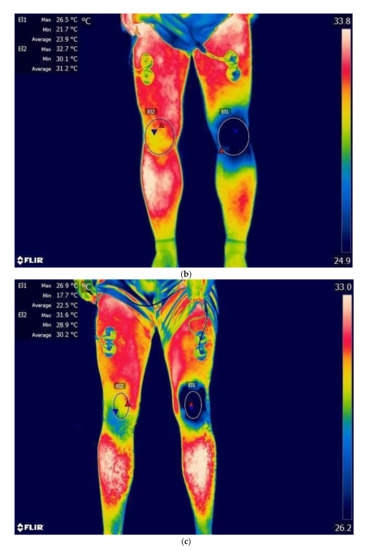 The measurements were performed with a FLIR A655sc digital infrared camera (Flir Systems Inc., Wilsonville, OR, USA) with noise-equivalent temperature difference (NETD) < 0.05 °C, focal plane sensor array size of 640 × 480, and measurement uncertainty of ±2% of the overall operational temperature range. It streams full-frame 16-bit data at 50 Hz, or up to 200 Hz with windowing, for high-speed processes. Its standard temperature range is −40 °C to 150 °C (−40 °F to 302 °F) [53]. The emissivity was set at 0.98. The analysis used the mean temperature value (Tmean) from a region of interest (ROI) using the original FLIR software (FLIR Tools+) from the areas of the anterior surface of both lower limbs: ROIE—the area of the knee joint exposed to cooling agents (left lower limb), ROINE—the area of the knee joint of the contralateral (unexposed, right) limb (Figure 2a–c).