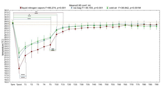 Change in the mean surface temperature of the knee joint after a 3-min application of three cooling agents. Legend: Data are expressed as mean with standard deviation. The dashed orange line represents the average ROI temperature before exposure. Two-way repeated measures ANOVA, F—ANOVA value, p—test probability level, test probability level determination for Tukey’s HSD post hoc tests: * p <0.05, ** p <0.01, *** p <0.001.