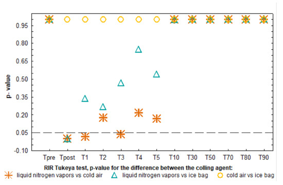 Exposure to the tested CAg caused an increase in the temperature of the contralateral area (unexposed limb), the dynamics of which depended on the cooling agent used (Figure 6). The analysis of variance for repeated measurements showed a significant influence interaction of time and the cooling agent on the change in ROINE temperature during the 90-min observation period (Figure 6). A significant increase in temperature was found, respectively, at 1, 2 and 5 to 55 min and from 60 to 80 min after IB application (Figure 7, ice bag), from 15 to 85 min after LNV application (Figure 7, liquid nitrogen vapors), and at 30 and from 65 to 90 min after the end of exposure to CA (Figure 7, cold air).