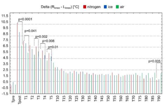Change in the value of the difference in temperature between the areas of the right (unstimulated) and left (stimulated) knee joint during 90-min observation. Legend: p—the level of test probabilities for one-way ANOVA for the differences between liquid nitrogen vapors, cold air, ice bag at the estimated time point. Data are expressed as mean.