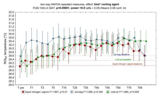 Characterization of the influence of exposure with cooling agents on the ROINE temperature during 90 min of observation. Legend: analysis of variance for repeated measurements, significance of the influence of time and cooling agent interactions on the ROINE temperature.