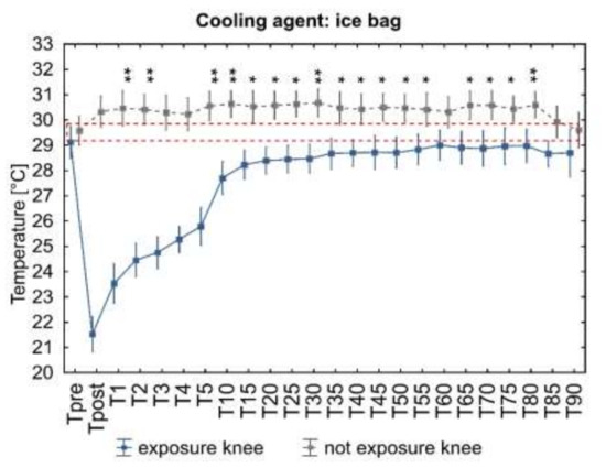The three-minute exposure of the knee joint to LNV, CA and IB significantly disturbs regional thermal hemostasis. The strongest response of the body is seen after exposure to LNV and the weakest after exposure to CA. The thermoregulatory response is general in nature: it covers both the exposed and the unexposed limb, which is reflected in changes in the surface temperature of both areas. Regardless of the cooling agent used, a characteristic course of the systemic reaction to the 3-min local stimulating effect of low temperatures is observed. The strongest response of the organism occurs immediately after the application of the cooling agent and for the first minute after its application, then it loses its intensity and increases again between 5 and 10 min of observation. The reaction of the unexposed, contralateral ROI is different for individual cooling agents in terms of the intensity of the temperature increase and the time points of their occurrence.
