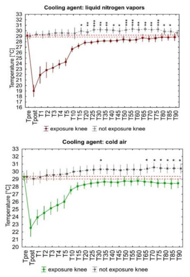Although local cryotherapy (LC) is performed with various cooling agents (CAg) such as ice, water, and gasses, in clinical practice, it is mostly performed with cooling gasses. Presently, LC with cooling gasses is very popular but the inference about the thermal (stimulus) effect on the tissues is mainly based on research carried out using ice packs. The proposed objective of the study was to evaluate the dynamics of temperature changes in the knee joint area in response to a 3-min exposure to liquid nitrogen vapors (LNVs), cold air (CA) and ice bag (IB). The study group included 23 healthy volunteers with an average age of 26.67 ± 4.56. The exposed (ROIE) and contralateral (ROINE) areas of the knee joint after exposure to CAg were observed. Immediately after 3 min of LC, the ROIE temperature dropped by 10.11 ± 0.91 °C after LNV, 7.59 ± 0.14 °C after IB and 6.76 ± 1.3 °C after CA. Significant tissue cooling was maintained up to 15 min after LNV (p < 0.01), 10 min after IB (p < 0.05) and 5 min after CA (p < 0.05). LC causes significant temperature changes both in ROIE and ROINE. The greatest cooling potential was demonstrated for LNV and the lowest for CA.
