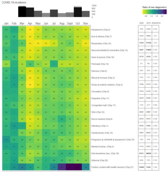 The heatmap presents, by month (x-axis), the ratio of new diagnoses in 2020 compared to new diagnoses in 2019, by ICD-10 groups (y-axis). Numerical values for the monthly ratios are provided for each month and ICD-10 group. Severe drops in diagnoses in 2020 are more yellow, similar diagnoses are in deep green, while increases in diagnoses are in purple. Monthly COVID-19 incidence per 100,000 for the region is plotted above the heatmap. The three columns to the right of the heatmap present counts of diagnoses by ICD-10 group in 2020, 2019, and the ratio of 2020/2019, respectively.