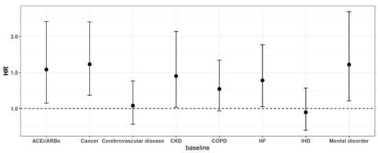 Effect of underlying conditions on mortality among COVID-19 patients. Note: ACEi/ARBs, cancer, cerebrovascular disease, CKD, COPD, HF, IHD, and mental disorder are added one by one to the model adjusting for the basic model gender, age, socioeconomic status, and underlying diseases such as diabetes and hypertension. ACEi/ARBs: angiotensin converting enzyme inhibitors (ACEi) and angiotensin II receptor blockers (ARBs); CKD: chronic kidney disease; COPD: chronic obstructive pulmonary disease; HF: heart failure; IHD: ischemic heart disease.