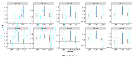 The effect of the underlying disease and whether or not taking ACEi/ARBs in the past or present on hospital stay according to the subgroup analysis based on the variable for classifying insurance types as a substitute variable for the socioeconomic status. Note: Model0: adjusted covariates age, sex and insurance type, Model1: adjusted covariates age, sex, insurance type and ischemic heart disease, Model2: adjusted covariates age, sex, insurance type and hear failure, Model3: adjusted covariates age, sex, insurance type and chronic obstructive pulmonary disease, Model4: adjusted covariates age, sex, insurance type and cancer, Model5: adjusted covariates age, sex, insurance type and chronic kidney disease, Model6: adjusted covariates age, sex, insurance type and end stage renal disease, Model7: adjusted covariates age, sex, insurance type and angiotensin converting enzyme inhibitors (ACEi) and angiotensin II receptor blockers (ARBs), Model8: adjusted covariates age, sex, insurance type and mental disorder. Model9: adjusted covariates age, sex, insurance type and cerebrovascular disease. DM, diabetic mellitus; HTN hypertension; IHD ischemic heart disease; HF heart failure; COPD chronic obstructive pulmonary disease; CAN cancer; CKD chronic kidney disease; ESRD end stage renal disease; ACEi/ARBs angiotensin converting enzyme inhibitors (ACEi) and angiotensin II receptor blockers (ARBs); MEN mental disorder; CVD cerebrovascular disease.