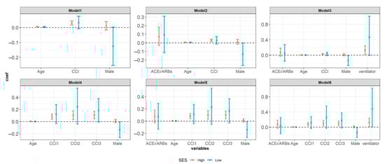 In the model based on age, sex, diabetes mellitus, and hypertension, in the group with high economic status, diabetes mellitus and hypertension had a statistically significant effect on the increase in hospital stay. In particular, hypertension was significant in all groups regardless of economic status. The size of the coefficient according to the economic status of hypertension was high in the group with low economic status. When each underlying disease was added to the basic model, hypertension (coefficient: 0.159, 95% CI: 0.008–0.310), cardiovascular disease (coefficient: 0.203, 95% CI: 0.038–0.372), a high socioeconomic status, and chronic obstructive pulmonary disease (coefficient: 0.1924, 95% CI: 0.0433–0.3431) were associated with a significantly longer duration of hospitalization (Figure 3).