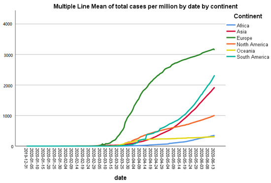 From 31st December 2019 to 14th June 2020, the outbreak of coronavirus disease 2019 (COVID-19) caused 7,984,067 confirmed cases and 435,181 deaths in the world. After standardizing the data of COVID-19 positive cases per million population, the highest number of cases were recorded in Europe, while the lowest one was recorded in Oceania (Figure 1). The cases in South America started to rise in the beginning of May 2020 and as shown in Figure 1, it is still rising steeply. North America also showed a trend of escalation in the number of cases in the first week of May 2020. In other continents, cases are gradually increasing as well but at a slower rate than neighboring countries (Figure 1).