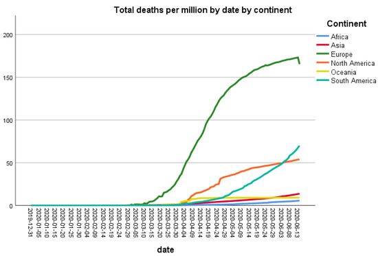 After standardizing the data of deaths per million population, the highest number of deaths were recorded in Europe followed by North America. The number of deaths in other continents is also increasing gradually from mid-May 2020, especially in South America (Figure 2).