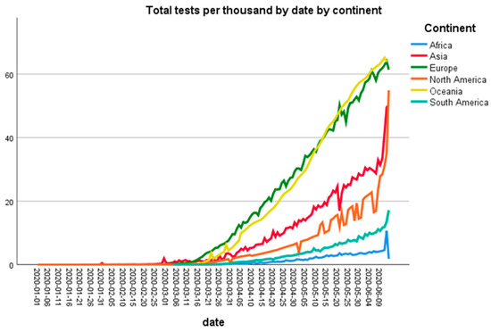 Number of cumulative coronavirus disease 2019 (COVID-19) tests (per thousand) by continent.