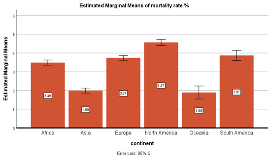 Figure 4 showed the mortality rate percentage (cumulative cases/cumulative deaths) by continents. The mortality rate by continents was as follows: North America 4.57%, Europe 3.74%, South America 3.87%, Africa 3.49%, and Oceania and Asia, lower than 2%.