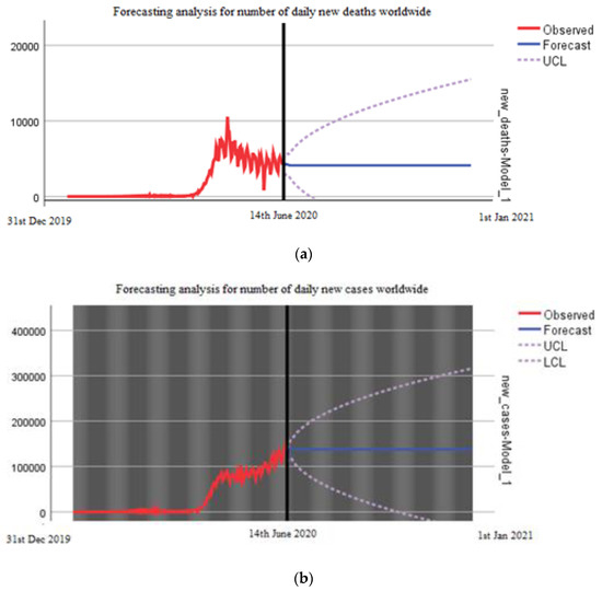 Figure 5a,b describes the forecasting analysis since the first case of COVID-19 wordwide. The data is predicted from 14th June 2020 to 1st January 2021. The worst scenario for the end of 2020 with the forecasting analysis predicts a range from 0 to 300,000 daily cases and a range from 0 to 16,000 daily deaths (Figure 5); since the data pattern did not demonstrate stationarity with first-order differencing, second-order differencing was done to achieve stationarity.