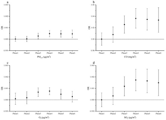 The relationship between the concentrations of four air pollutants and the gynecological cancer in six exposure phases. (a) The OR and 95% CI of gynecological cancer with a 1.0 μg/m3 increase in PM2.5 concentration; (b) the OR and 95% CI of gynecological cancer with a 1.0-mg/m3 increase in CO concentration; (c) the OR and 95% CI of gynecological cancer with a 1.0-μg/m3 increase in O3 concentration; (d) the OR and 95% CI of gynecological cancer with a 1.0-μg/m3 increase in SO2 concentration.