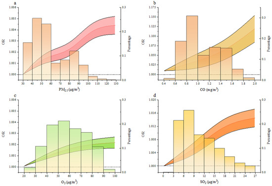Exposure–response curve between air pollutant exposure and the risk of gynecological cancer. (a–d), Exposure–response curve of gynecological cancer risk with respect to PM2.5 (a), CO (b), O3 (c), and SO2 (d) exposure. The red line represents the OR value, and the black line denotes the 95% confidence intervals. The histogram shows the distribution of the corresponding pollutant concentration. Here we controlled confounders.