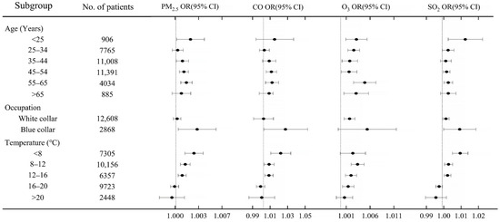 Relationship between air pollution and gynecological cancer with different social and demographic characteristics. The risks of four air pollutants on the risk of gynecological cancers is evaluated in each subgroup with PM2.5, O3, and SO2 increase by 1.0 μg/m3 and CO increase by 1.0 mg/m3.