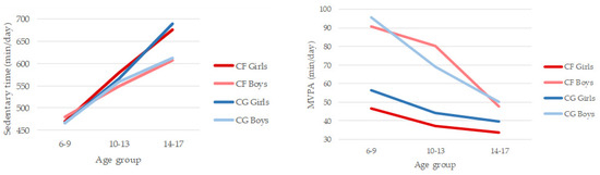 In the 6–17 age range sedentary time increased by 2 h and 40 min per day in children with CF and 3 h and 47 min in the CG. On the other hand, MVPA decreased by 13 min per day in children with CF and 47 min per day in children from CG. Results of the 2 (CF group/CG) × 2 (gender) × 3 (age group) ANOVA for SB indicated significant main effects for age group (F(2,77) = 19.958, p < 0.001; η2 = 0.341) (Figure 1). Post hoc tests showed that all the age groups differed significantly, with SB becoming higher as children got older, especially in girls in both groups (CF and CG). No other significant differences were observed. Results of the 2 (CF group/CG) × 2 (gender) × 3 (age group) ANOVA for MVPA indicated significant main effects for gender (F(2,77) = 22.592, p < 0.001; η2 = 0.227) and age group (F(1,77) = 5.962, p < 0.01; η2 = 0.134) (Figure 1). Boys (Mboys = 73 min/day) were significantly more involved in PA, engaging in MPVA for 30 min more per day than girls (Mgirls = 43 min·day−1). CF girls were the least active in the three age groups. Post hoc tests showed that younger children (6–9 years; M = 67 min·day−1) also differed significantly from older children (14–17; M = 40 min·day−1), the drop being more pronounced in boys. No other significant differences were observed.