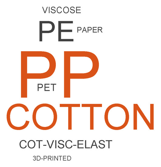 A total of 242 FMMs were collected and classified according to the type of material used for the internal layer in contact with the skin. When FMs were composed of more than one layer, the internal portion in contact with the skin of the face was used for grouping purposes. Hence, eight main groups were identified, namely: polypropylene (PP), paper, cotton, polyester (PE), polyethylene terephthalate (PET), 3-dimensional (3D) printing, and viscose. Figure 1 depicts a word cloud of the materials composing the FM samples. As shown by font colour and size, the most frequently used materials were PP 52.5% (127 of 242), cotton 19.4% (47 of 242), and polyester 13.2% (32 of 242). The least-numerous groups were a combo of cotton, viscose and elastane 3.7% (9 of 242), PET 3.3% (8 of 242), viscose 3.3% (8 of 242), paper 2.5% (6 of 242), and 3D printing 2.0% (5 of 242).