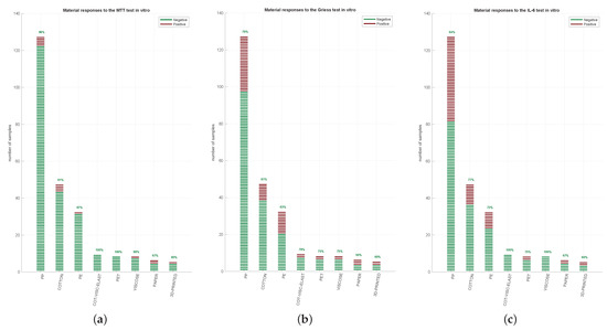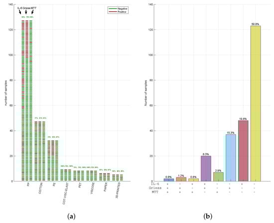 In summary, among the 242 tested FMMs, only 2 (1.2%) failed (1 PP, 1 cotton) all the 3 tests, 126 FMMs (50.8% of total) passed them all (61 PP; 3 paper; 28 cotton; 7 cotton, viscose, and elastane; 18 PE; 4 PET; 2 3D printed and 5 viscose; Figure 3a) and the other 120 FMMs (48% of total) failed at least one. Given the high number of FMMs that failed the multi-test approach, we summarised the concordance of three tests in Figure 3b. Remarkably, in 8% of cases, MTT was negative while being positive for IL-6 and Griess (violet bar), showing how materials can stimulate an inflammatory activity despite the lack of cytotoxicity. Similarly, MTT was the only positive test in very few cases (2.8%; green bar), with a positive for Griess and IL-6 in 15.7% (blue bar) and 19.4% (red bar), respectively. These data indicate how Griess and IL-6 represent two distinct markers of inflammation, often resulting in potentially irritating FMM response.