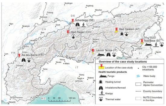Selected case studies in the European Alps including natural offer and health touristic products. Source: Map based on [,,,,].