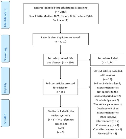 The purpose of this review of the literature was to identify studies that detail interventions that include a partner or family member, developed for women who are at risk or currently experiencing perinatal depression and/or anxiety [37,38,39]. This review adhered to the Preferred Reporting Items for Systematic Reviews and Meta-Analyses [40].