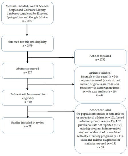 Studies were excluded if their title did not include at least one keyword of the three basic keyword categories referring to “back pain,” “core,” “athletes” and/or “sports,” and if they were incomplete (abstracts), not peer-reviewed, or did not contain original research. Books, dissertations, theses, and case studies were also excluded. Studies published after the year 2000 were preferred. The key inclusion criteria were as follows: (i) the population of interest consisted of athletes of individual and team sports (youth, adult, national, and international competitions); (ii) a prospective or cross-sectional cohort design was used; (iii) a related prevalence rate of LBP was reported; (iv) the training program in intervention studies was described; (v) a randomized controlled trial (single-blinded or double-blinded) was conducted, and (vi) valid and reliable testing methods were used. Studies that failed to meet the eligibility criteria for this review were excluded.