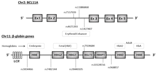 - El-Ghamrawy, M.; Yassa, M.E.; Tousson, A.M.S.; El-hady, M.A.; Mikhaeil, E.; Mohamed, N.B.; Khorshied, M.M. Association between BCL11A, HSB1L-MYB, and XmnI γG-158 (C/T) gene polymorphism and hemoglobin F level in Egyptian sickle cell disease patients. Ann. Hematol. 2020, 99, 2279–2288. [Google Scholar] [CrossRef]