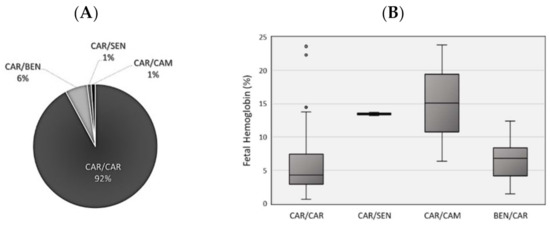 The distribution analysis of haplotype frequencies (Figure 2A), showed that the most prevalent was the homozygous CAR/CAR, detected in 92.15% (n = 176), followed by the CAR/BEN in 5.76% (n = 11). The other haplotypes observed were very rare: 1.05% CAR/SEN (n = 2), 1.05% CAR/CAM (n = 2). The statistical analysis showed significant differences between groups for the HbF values (Table 1). In the sampled population, the CAR/CAM individuals had the higher values of erythrocytes, HbF (Figure 2B) and hemoglobin, whereas the CAR/CAR had the lowest. As for the gamma ratio parameter, the CAR/CAR had the lowest values and the CAR/SEN the highest.