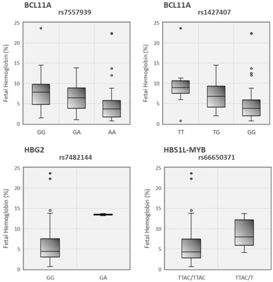 Several studies have already demonstrated that HbF levels are regulated by variants in three main quantitative trait loci (QTL): BCL11A, HBS1L-MYB intergenic region, and Xmn1-HBG2, which together can contribute to between 20–50% of HbF variability in SCA patients [11,13,14]. More specifically, it was proven by the use of a multiple linear regression approach, that the combination of only three variants in those three regions (rs1427407, rs66650371 and rs7482144) could account for 31.9% of HbF variance [15].