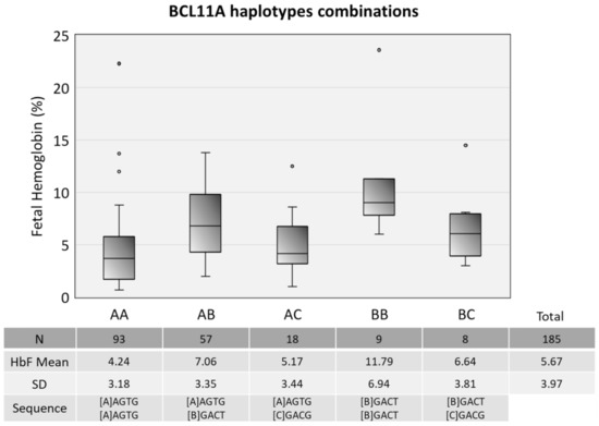 All of the studied polymorphisms were in Hardy–Weinberg equilibrium (p > 0.05). We defined a linkage disequilibrium region in chromosome 2, including the BCL11A SNPs. The Arlequin software defined ten different combinations of haplotypes in our cohort, but given the low frequency of some, we only included in this paper the most prevalent ones. These genotypes are compared with HbF values in Figure 4.