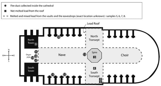On 31 January 2020, eight fallen fragments of the former roof and spire were sampled (four of melted and mixed lead, and four of lead not melted), as well as nine dust samples from inside the cathedral, downwind of the fire—thus considered fire dust. The locations of these samples are indicated in Figure 1. Although samples 1 and 2 are located close to each other, one is from a roof sheet, probably dated from the XIXth century; the other one is from a valley gutter dated from a restoration in the XXth century.