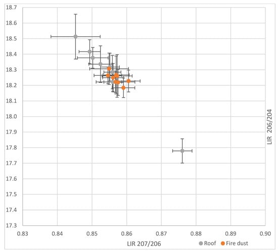 Figure 3 shows lead isotopic ratios for cathedral fire dust and home dust in France. It indicates that the fire dust IR, with uncertainties, overlaps with many dust lead IRs measured in the homes of young children living in France in 2008–2009, under similar sampling and IR determination conditions [].