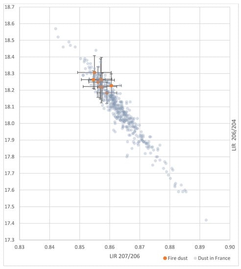 Figure 4 shows the lead isotopic ratios of cathedral dust samples and those of blood from young children living in France in 2008–2009 []. It indicates that the dust IRs overlap with several lead IRs that were measured 10 years before the fire, in similar sampling and IR determination conditions.